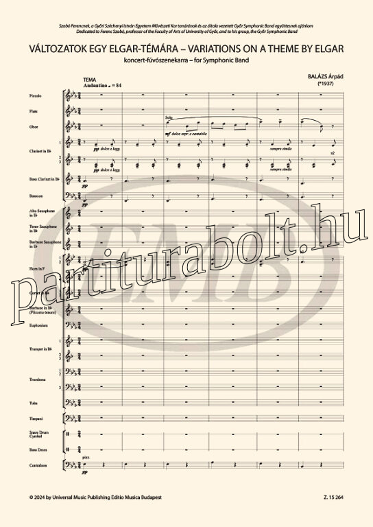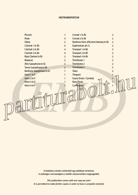 Hangszerelés: picc, fl, ob, cl Bb, cl b Bb, fg, sax a Bb, sax t Bb, sax bar Eb - cor F, crnt Bb, flic t Bb, euf, tr Bb, trb, tb - timp, tamb mil, ptti, gr c - cb