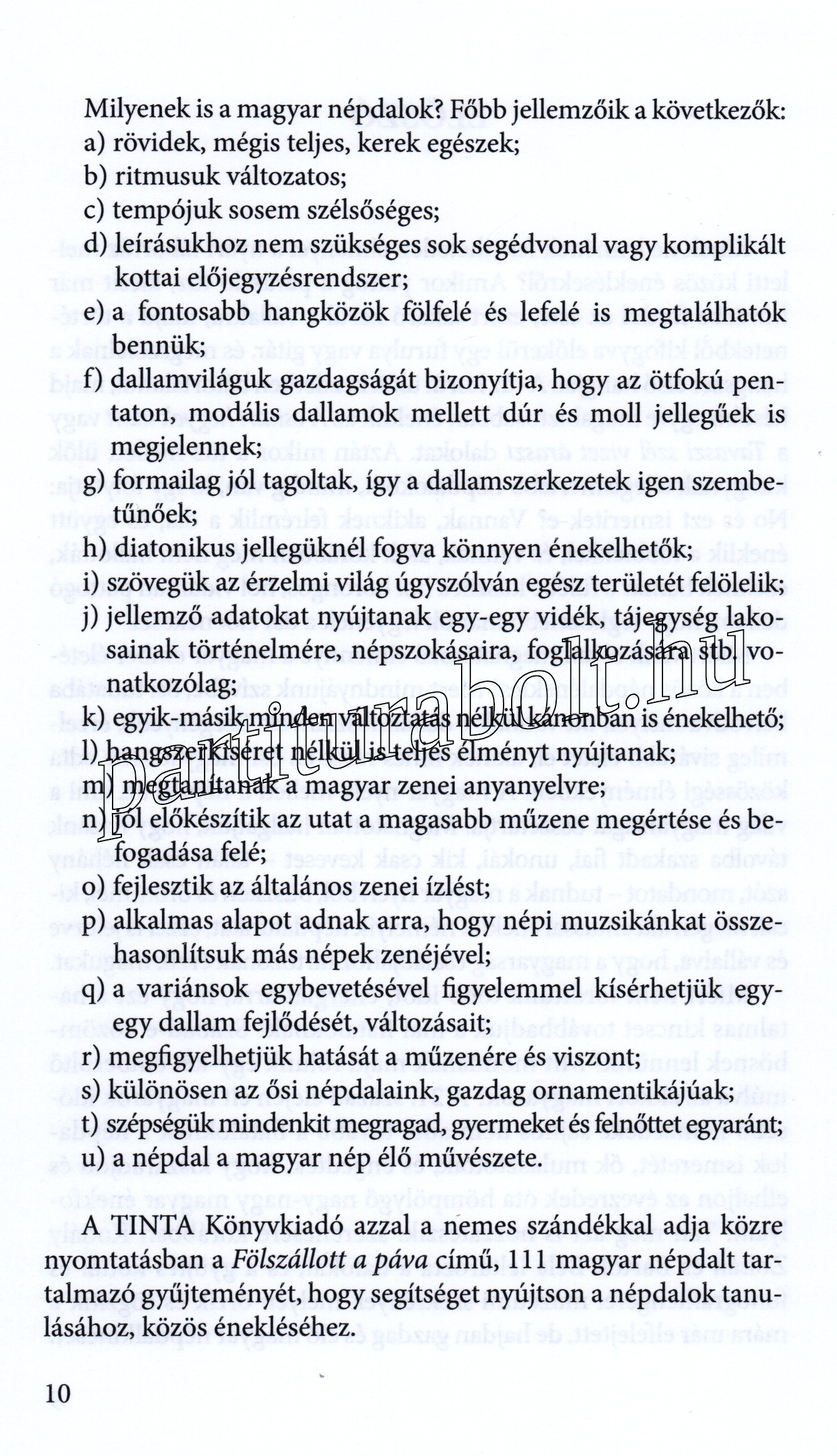 A TINTA Könyvkiadó azzal a nemes szándékkal adja közre nyomtatásban a Fölszállott a páva című, 111 magyar népdalt tartalmazó gyűjteményét, hogy segítséget nyújtson a népdalok tanulásához, közös énekléséhez. Bízunk benne, hogy kiadványunkkal hozzájárulhatunk a magyar népdalkincs megőrzéséhez és mind szélesebb körű terjesztéséhez.