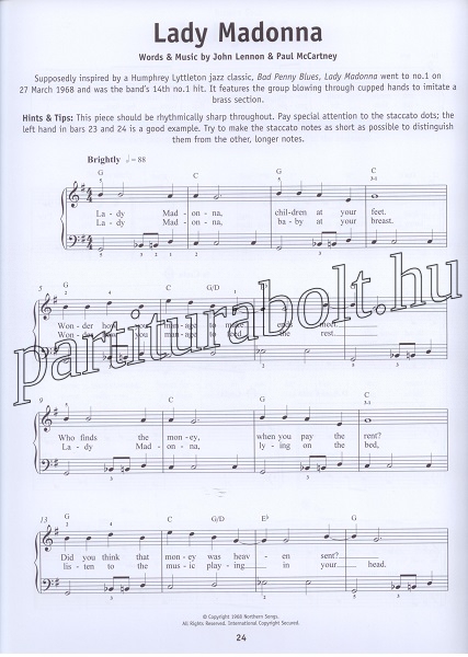 Könnyű feldolgozások 23 klasszikus The Beatles dal alapján alapszintű zongoratanulók számára. Ez a dalgyűjtemény, amely a híres zenekar teljes pályafutását felöleli, kísérő szólamot, valamint számos hasznos tippet is tartalmaz.