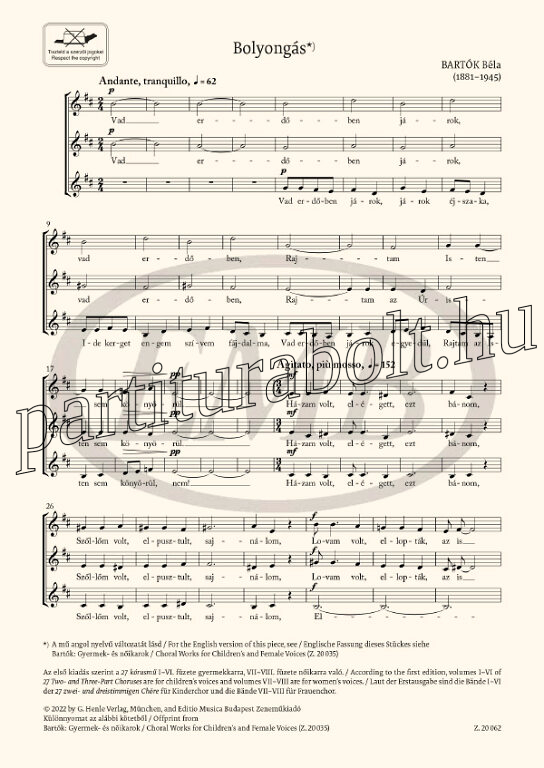 Bartók Béla: Bolyongás - egyneműkarra (kórus lapkotta)